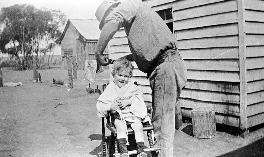 Arthur Wright cutting his son Jim's hair. They are in a farmyard.