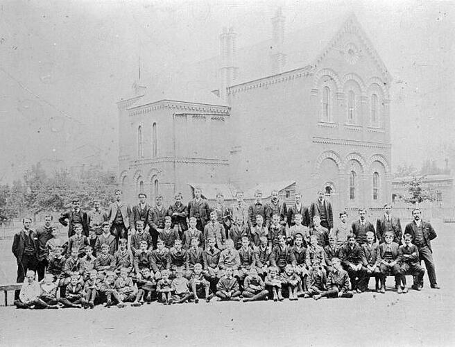 A school photograph outside Ballarat College. The Australian Arms Hotel is on the right.
