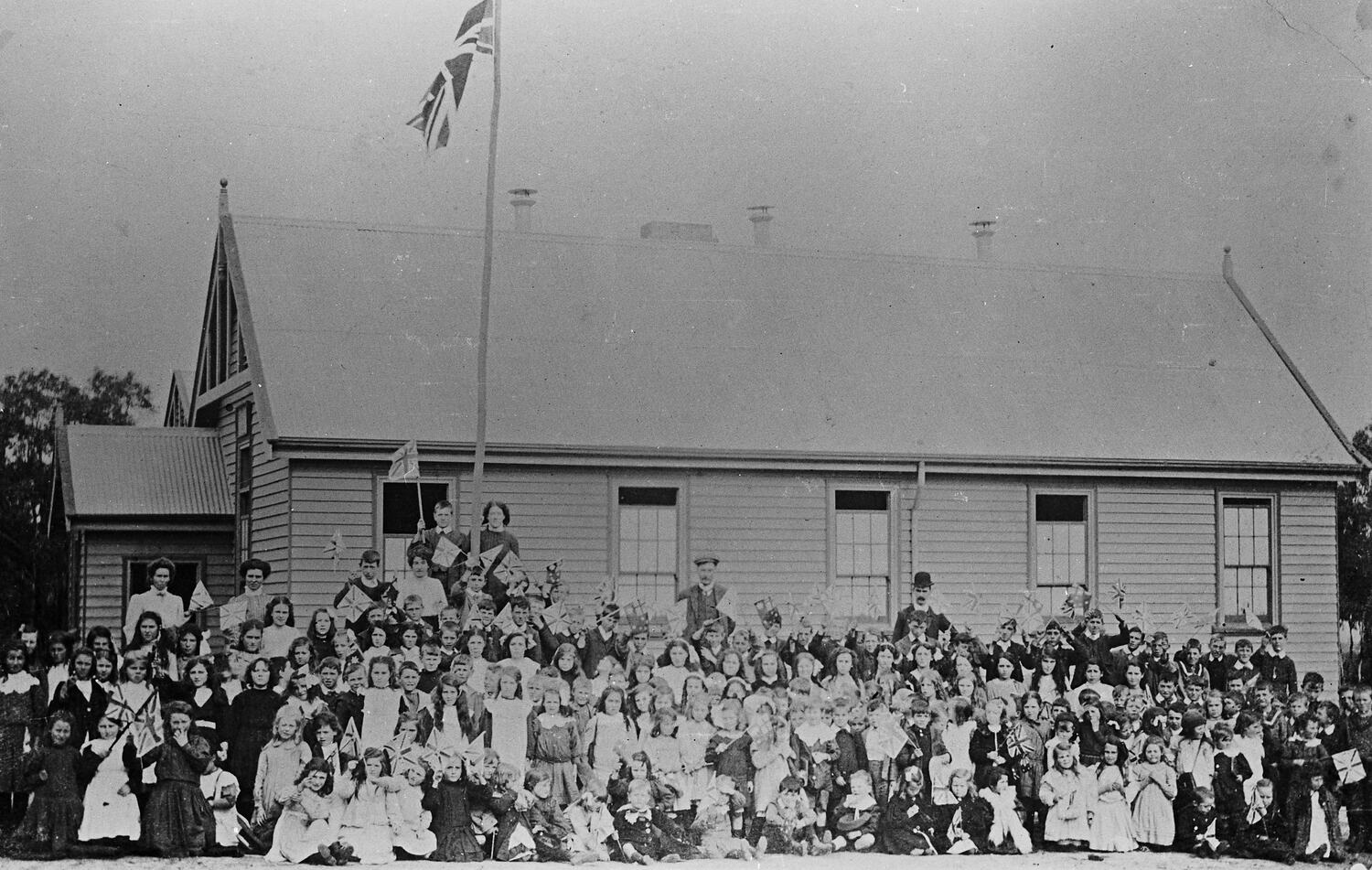 Pupils and teachers outside the Berringa School, No.905. There is a union jack on a flagpole and a number of the children hold flags.