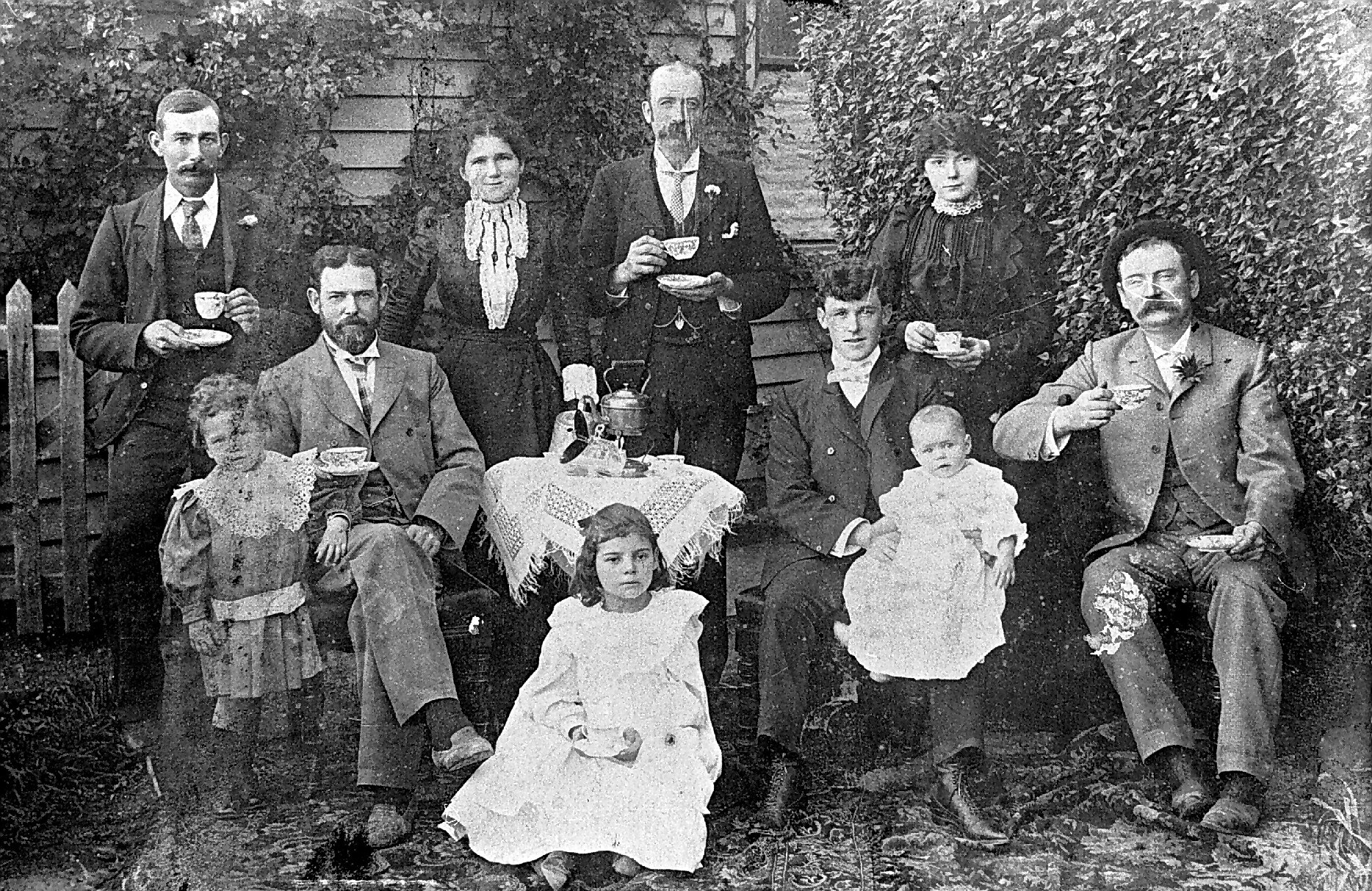 Members of the Stewart family. They are seated by a table containing a tea set and most are holding cups and saucers.