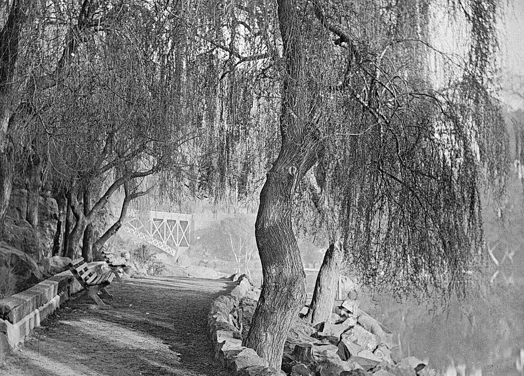 A path and seats beside the South Esk River in the Cataract Gorge. The Cataract bridge is in the background.