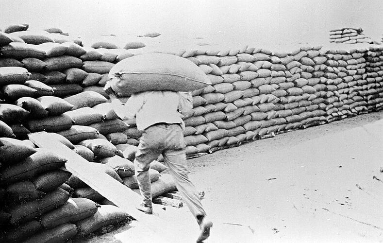 A man carrying a sack of grain on his shoulders. He is walking up a ramp to place the sack on the grain stack.