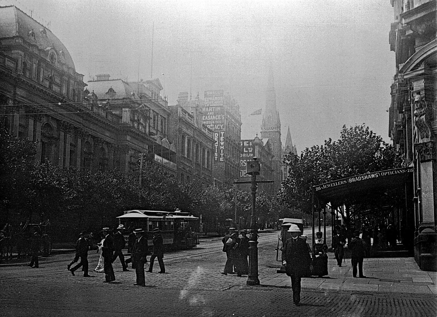 Looking east along Collins Street from the corner with Swanston Street. The Melbourne Town Hall is on the left and a cable tram is travelling along Collins Street. Bradshaws, Opticians is on the right and the spires of Scots Church and the Presbyterian Church.