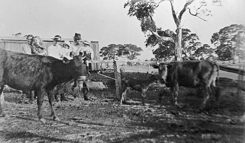 A family group inspecting cattle. Small children are perched along the rail of the cow yard, supported by adults.