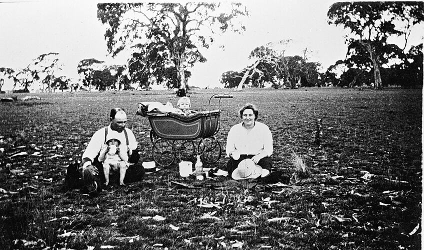A family at a lunch break in a paddock. There is a baby in a pram and the man holds a small child.