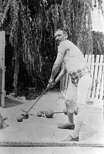 A man practising the hammer throw. He is wearing tartan briefs. There are dumb bells on the ground behind him.