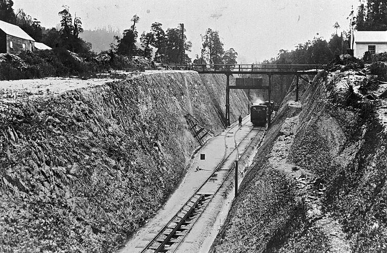 The ABT system railway to Queenstown. This was a rack and pinion system. There is a light dusting of snow on the ground.