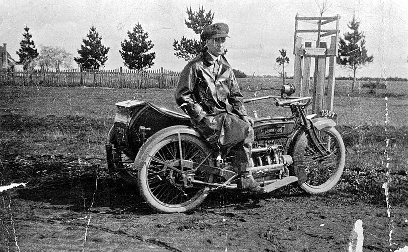 A man with a four-cylinder Henderson motorcycle and side-car stopped beside the Avenue of Honour.