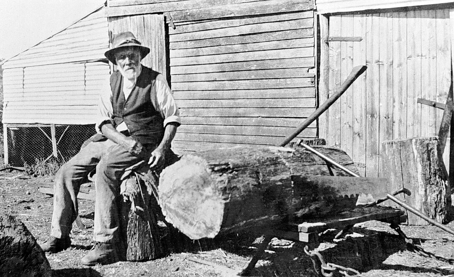 An elderly man seated beside a large log. There is a saw partway through the log. The building behind is a hayshed.