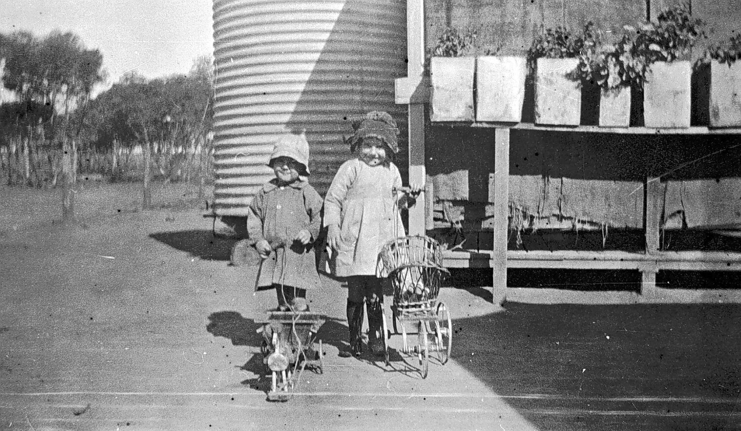 Two small girls. One is holding a pram and the other a toy horse and wagon. There are kerosene tins with plants growing in them on the right and a water tank behind the girls.