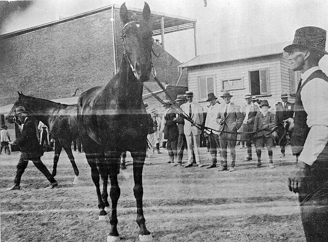 A racehorse, 'Roxica', held by a man at the right of the photograph. There is a grandstand in the background and a number of onlookers.