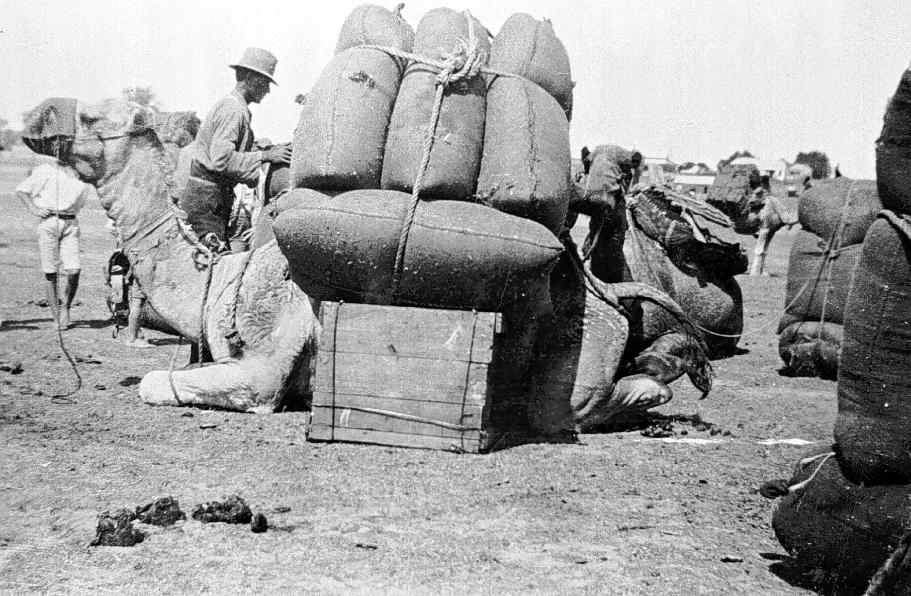 The camel in the foreground is kneeling while his load is being adjusted. The bales of wool are being balanced on a crate while this is done. Other camels can be seen in the background.