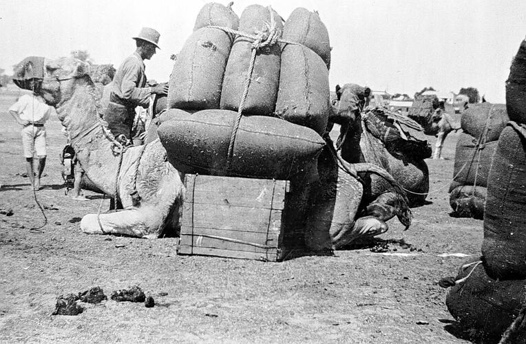 Camels carting wool to Mildura. The camel in the foreground is kneeling while his load is being adjusted. The bales of wool are being balanced on a crate while this is done. The image dates to circa 1920.