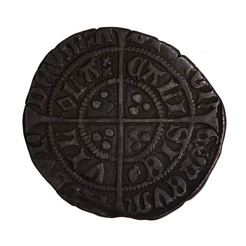 A crowned bust of the King facing within a tressure of nine arches; around, (mm cross III) HENRIC DI GRA REX ANGL Z FR