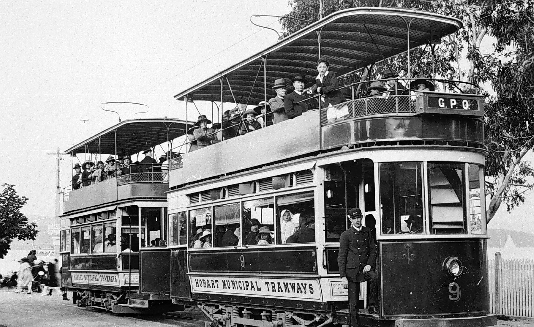 Two double decker trams of the Hobart Municipal Tramways. The upper section of the tram is roofed but there is no side protection for those passengers.