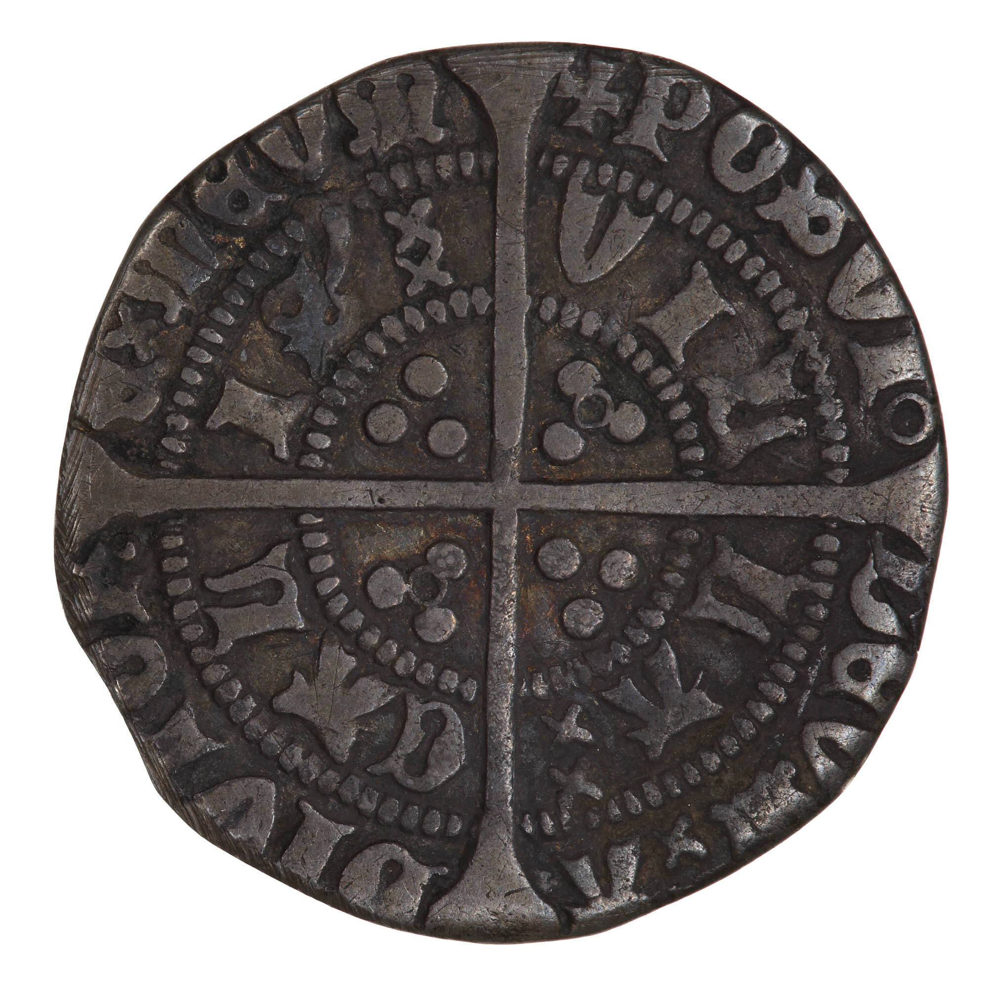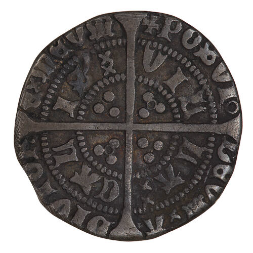 A crowned bust of the King facing within a tressure of nine arches, an annulet on each side of neck; around, (mm cross V) HENRIC DI GRA REX ANGL Z FR.