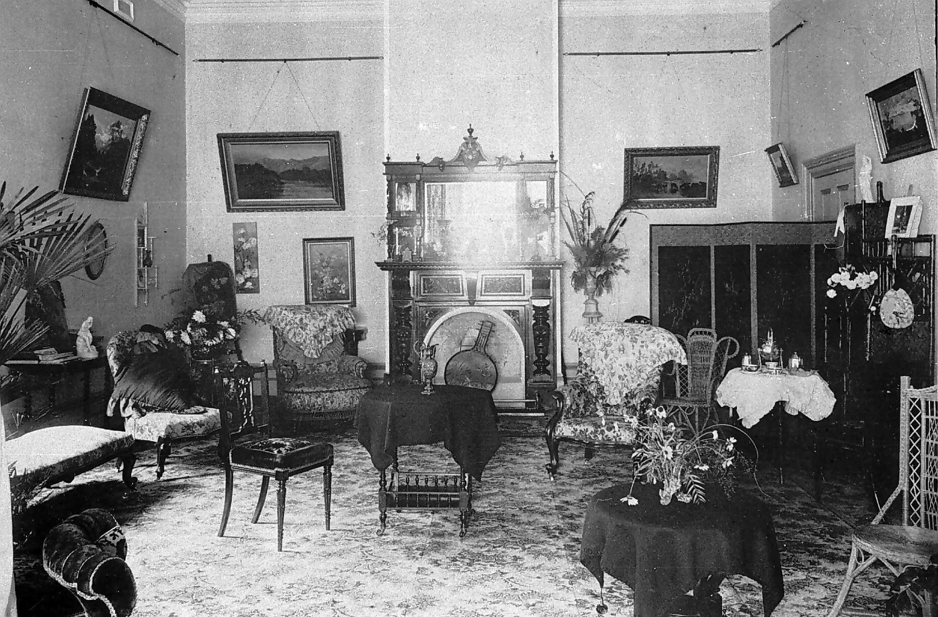 Drawing room of Dr. Charles Smith. There are bellows in the fireplace, a screen on the right and various tables and chairs.