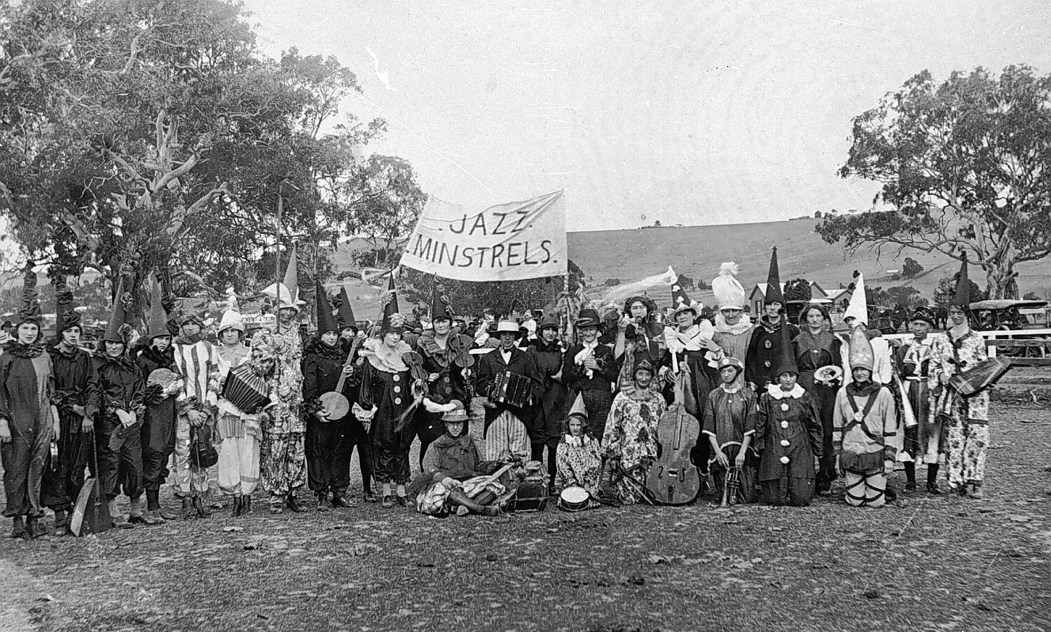 A group in fancy dress. There is a banner reading 'Jazz Minstrels'. Some are dressed as Pierrots.