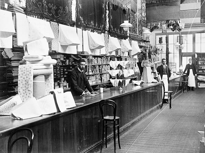 Negative of Mr. Hussey, Fred Friend and Mr. Osborne in the Drapery section of J.W. Trangmar General Store, Coleraine, 1906.