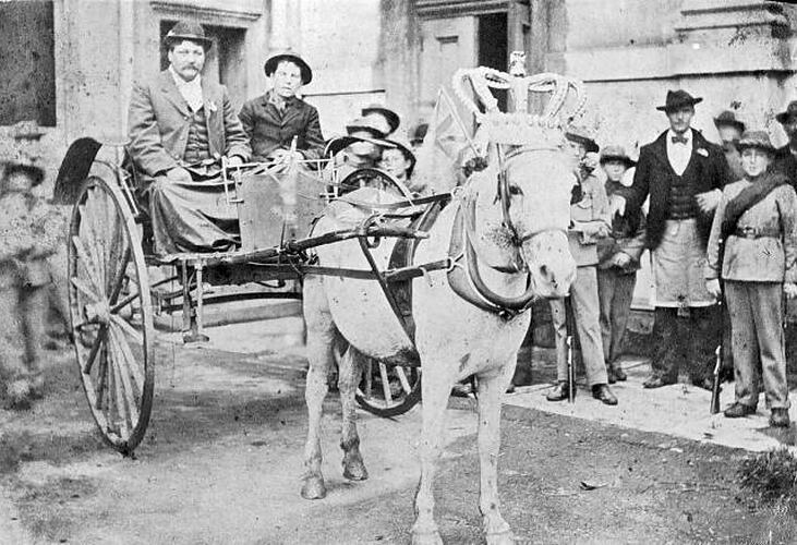 A man and a young boy in a horse-drawn buggy. There is a crown which may be on the horse 's head or held on the pavement immediately behind the horse. There are boys in army uniform on the side of the road.