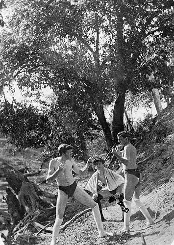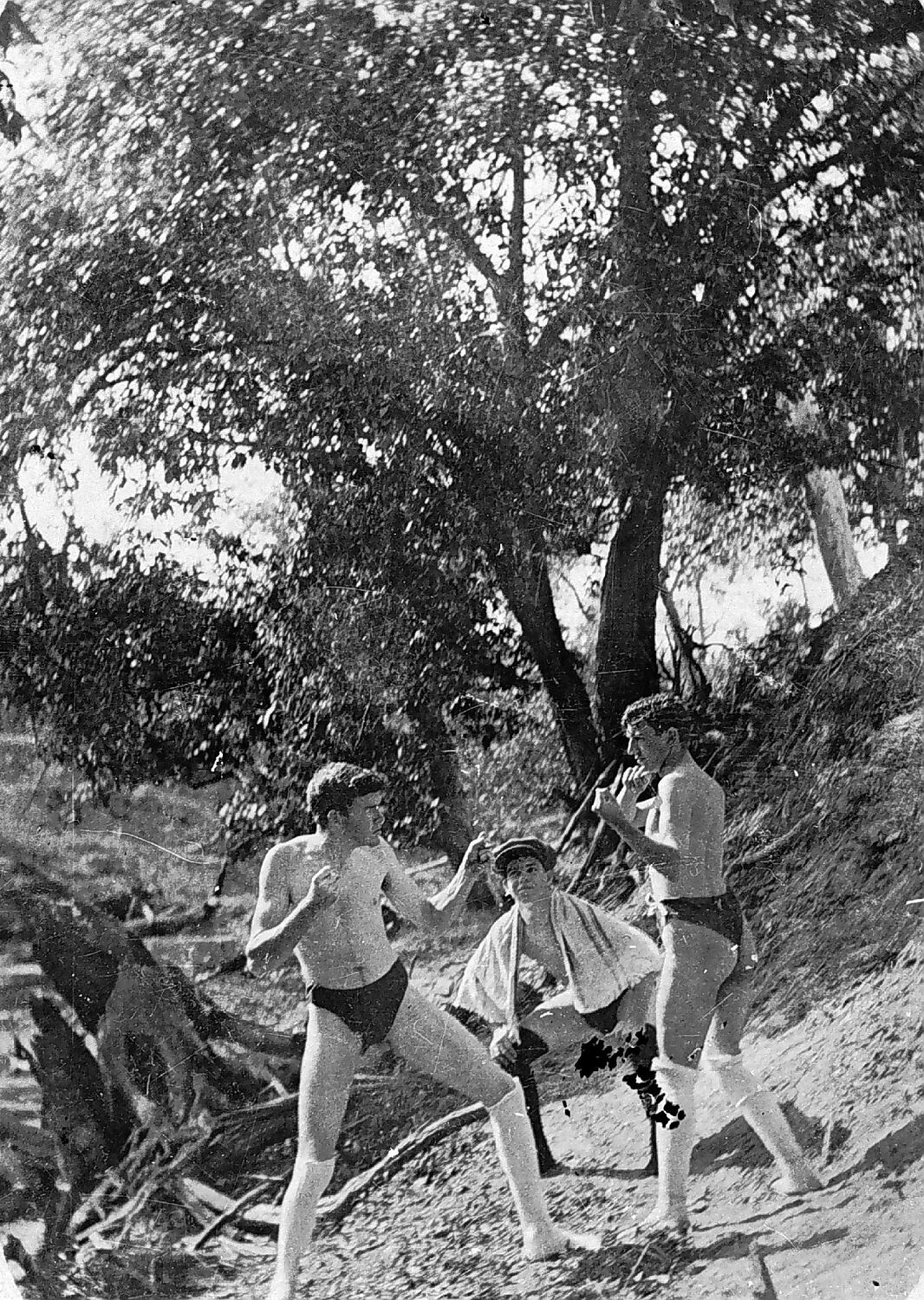 Three young men in swimming trunks and knee-length socks. Two are sparring and the third, who has a towel over his shoulders, is acting as referee. The contest is taking place on very uneven ground.