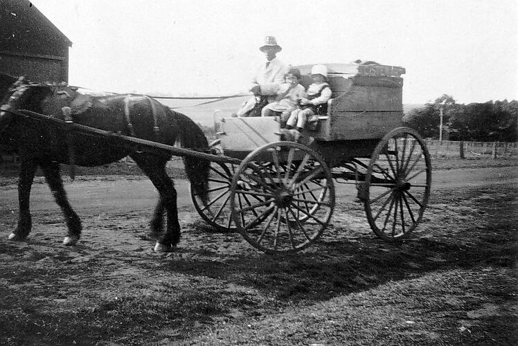 J. C. Stewart 's bread cart delivering bread in Addison Street. The delivery man, William McEwan, has his children with him. There is a building in the background.