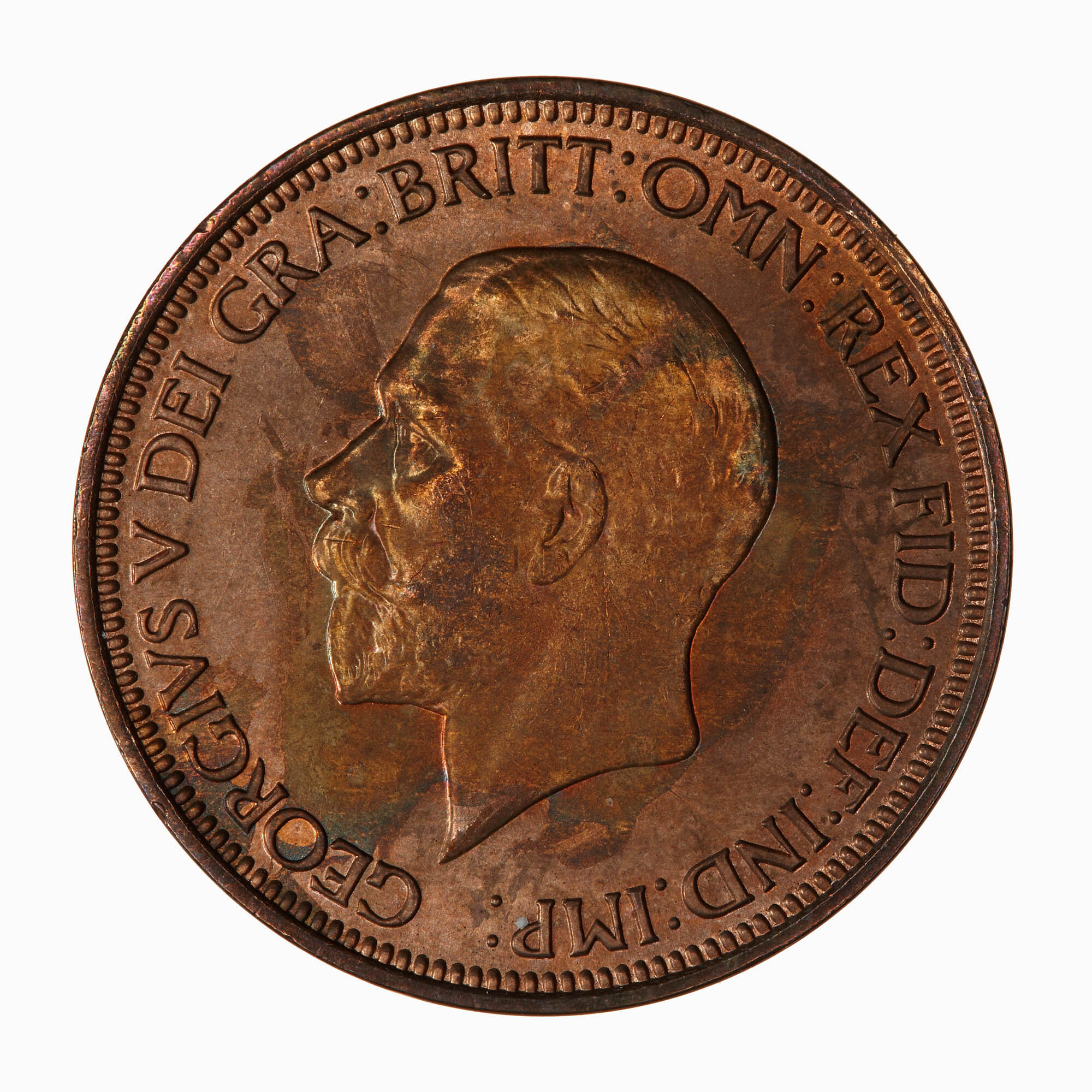 Bare head of the King facing left; below on neck truncation in small letters, B.M. (Bertram MacKennal); around, GEORGIVS V DEI GRA: BRITT: OMN: REX FID: DEF: IND: IMP:
