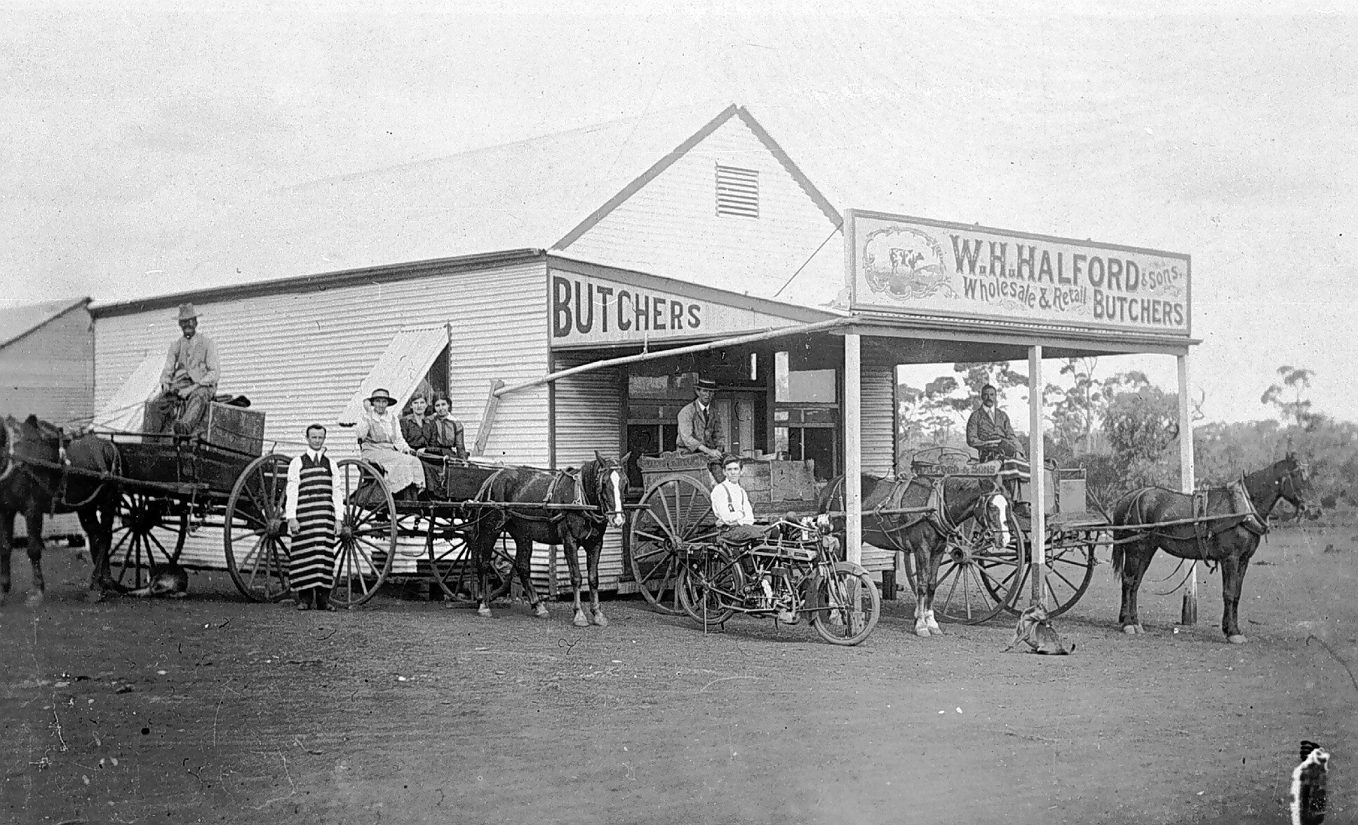 Advertising, Butchers, Delivery Carts, Dogs, Domestic Animals, Horsedrawn Vehicles, Motor Cycles, Verandahs, Workers