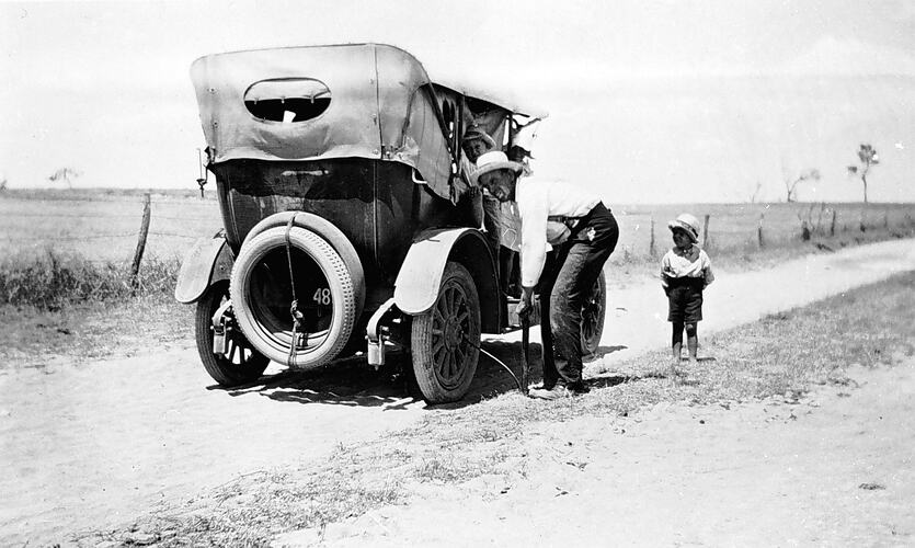 A man pumping up a tyre, watched by his young son. The car, which carries two spare tyres is on a country road.