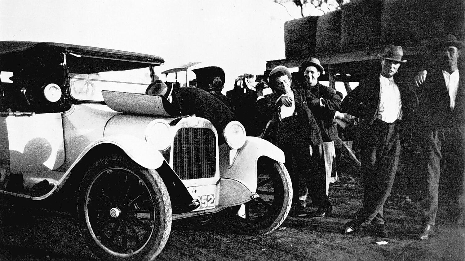 A shearing team with their Dodge car. The hood is raised and one man is inspecting the engine. There are wool bales on a platform on the right.
