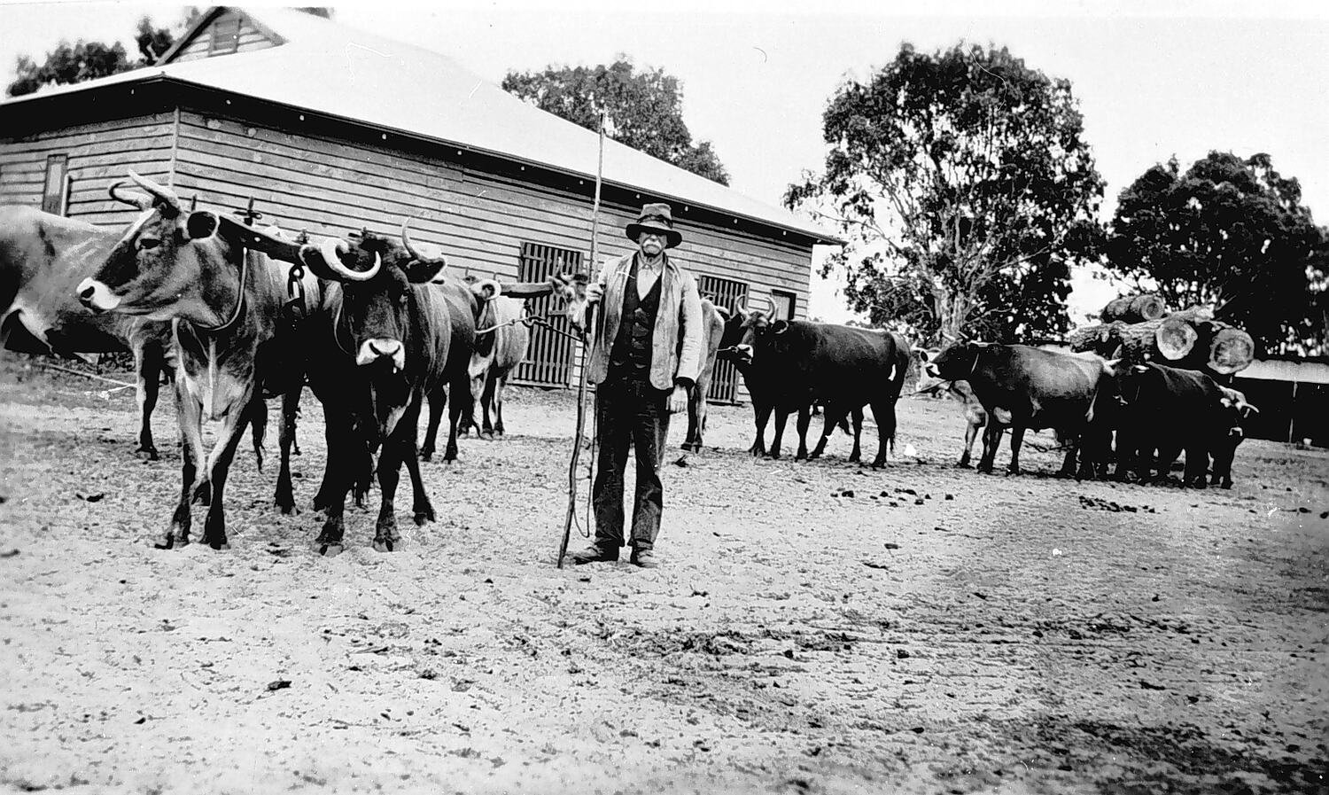 Bullock driver with his team on 'Trevellas Downs' station. The wool shed and the machinery shed in the background.