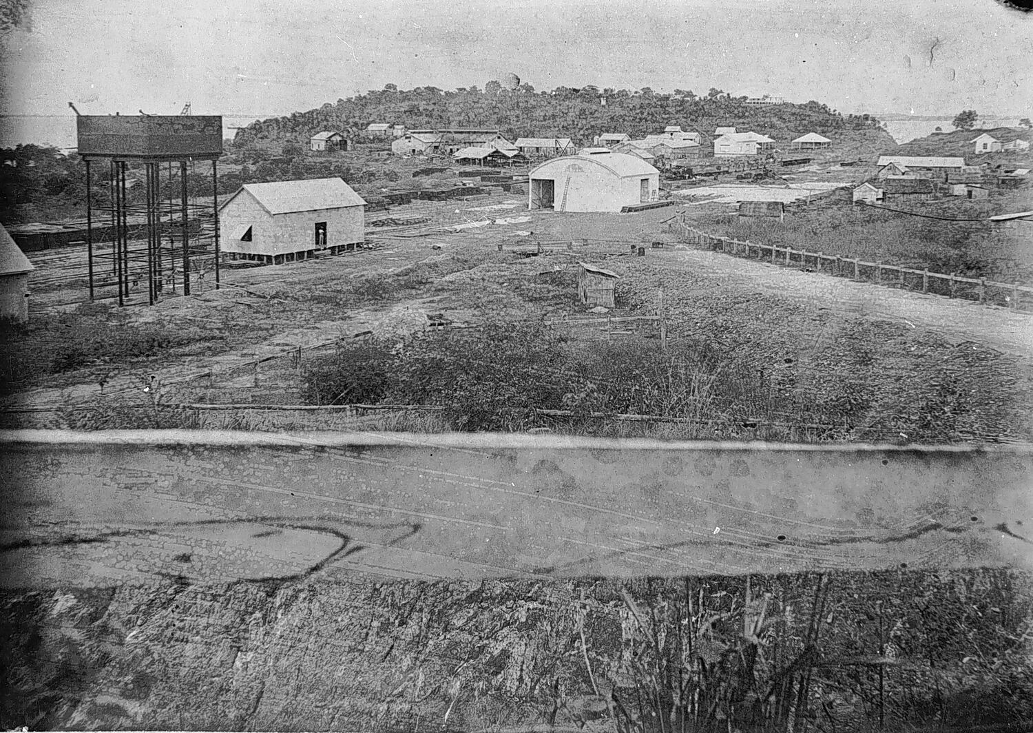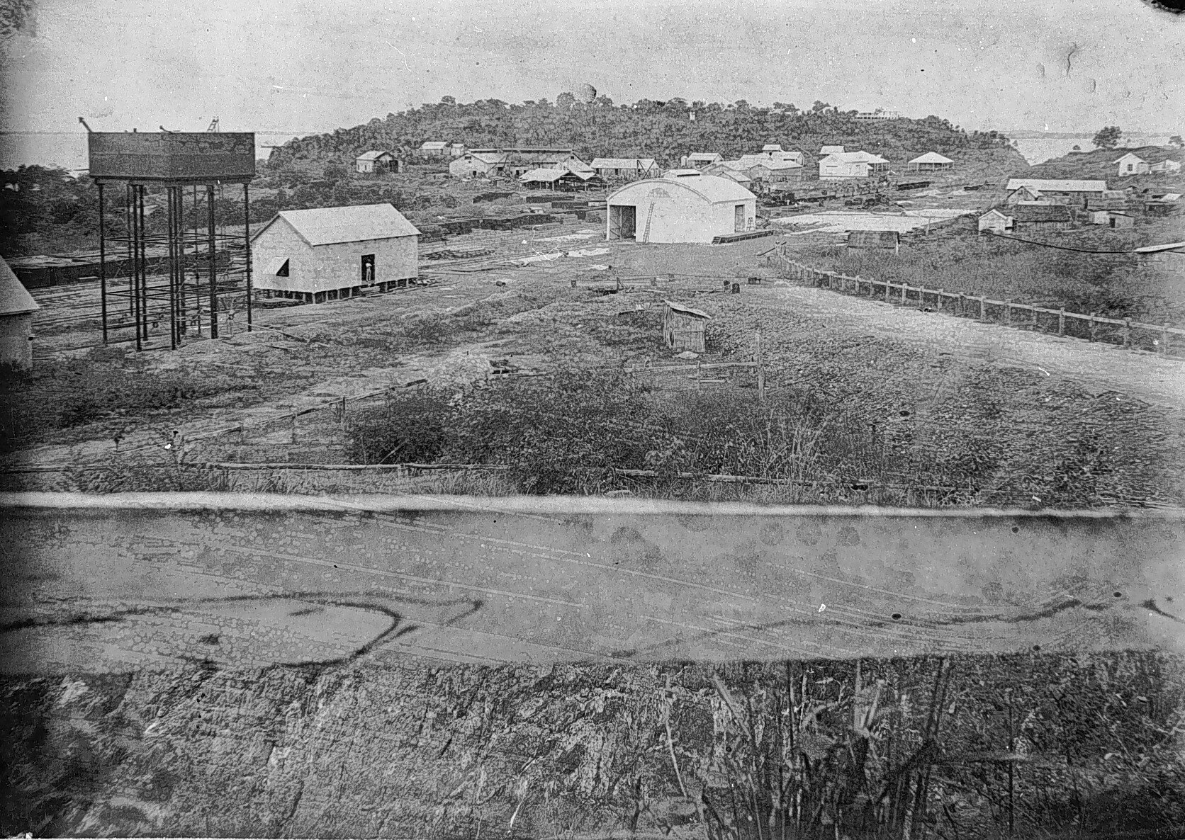 Buildings in Port Darwin. There is a water tank on the left and railway lines in the background. There is a fence rail across the front of the photograph.
