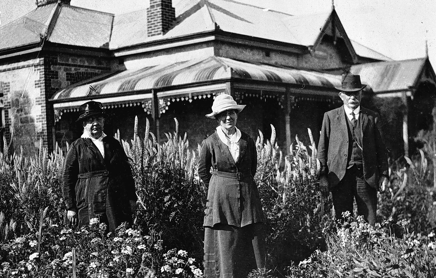 A man and two women standing in the garden of 'Hectorville' house. (see also MM 003109).
