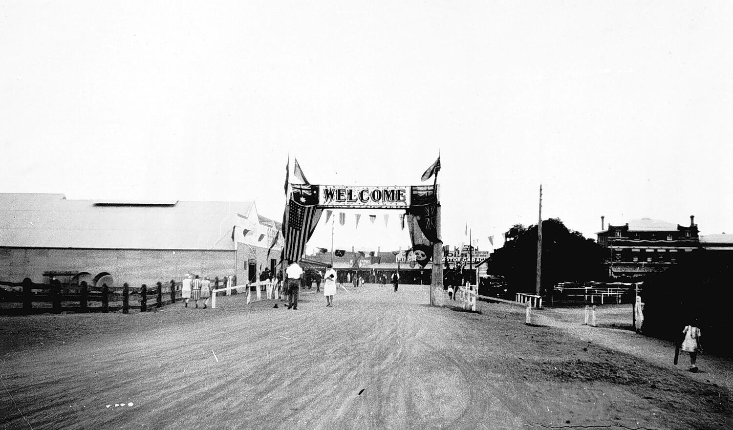 The welcome arch in the 'Back to Nhill' celebrations. Young Brothers Stock & Station Agents building is on the right.