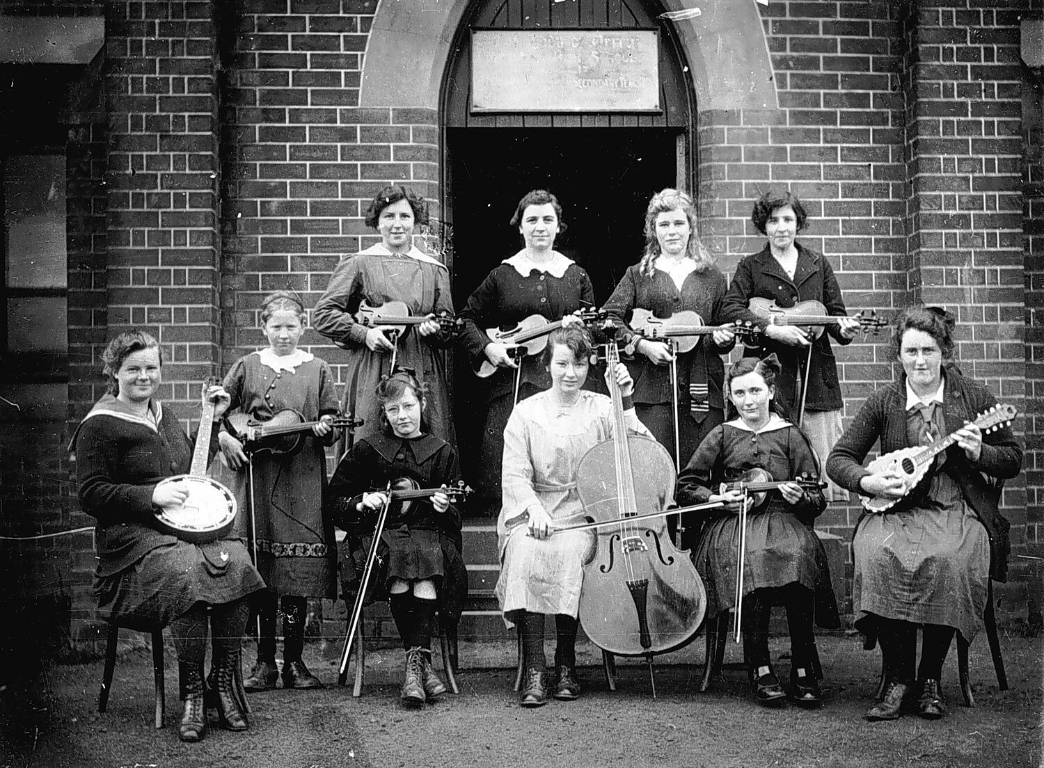 A group of schoolgirls, with their musical instruments, on the steps of the convent of mercy. Seven of the girls hold violins, one a banjo, one a mandolin and one a cello.