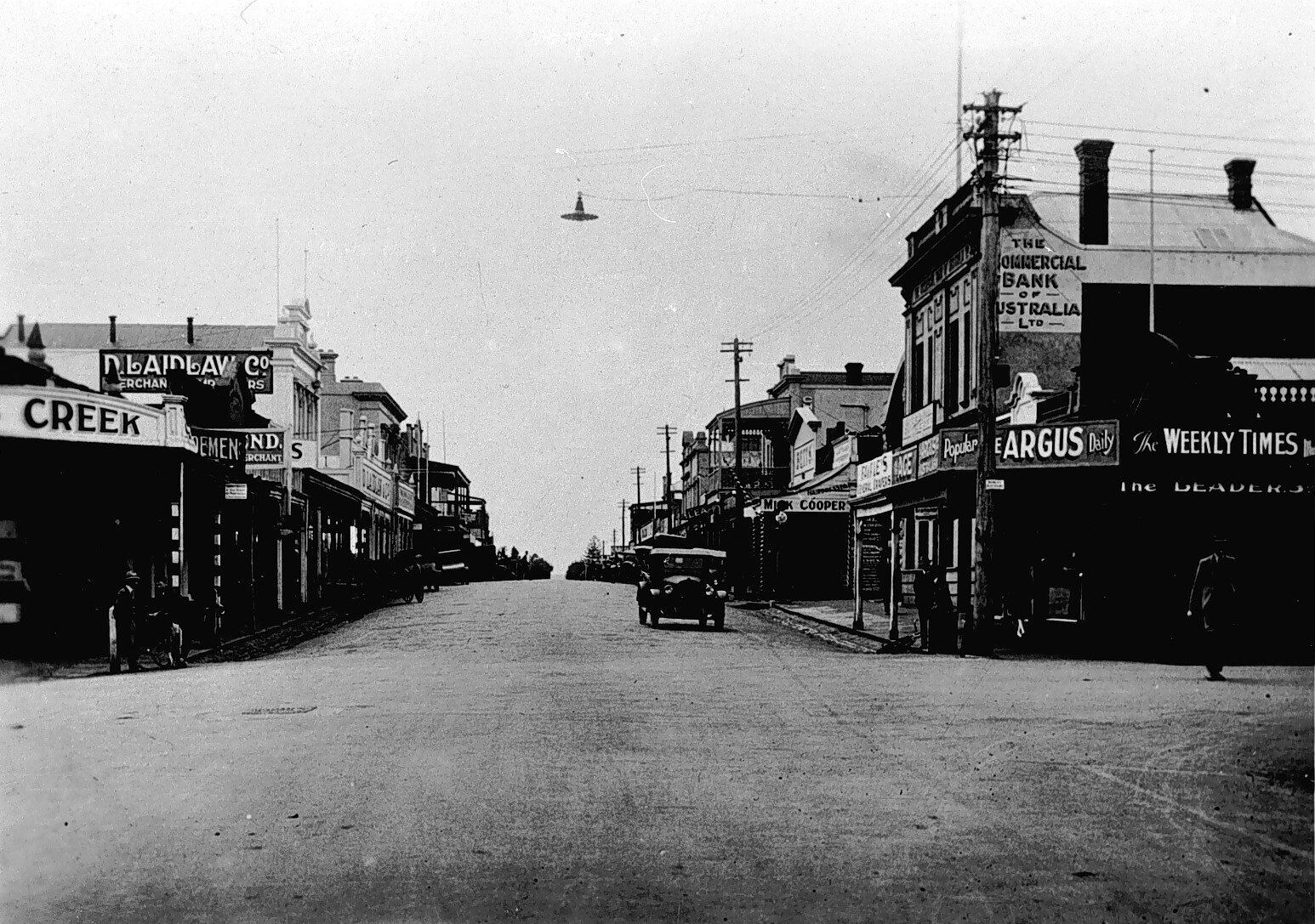 Looking east along Gray Street, Hamilton. On the left D. Laidlaw & Company General Store, then the National Bank in the two story building. On the right the Commercial Bank of Australia.