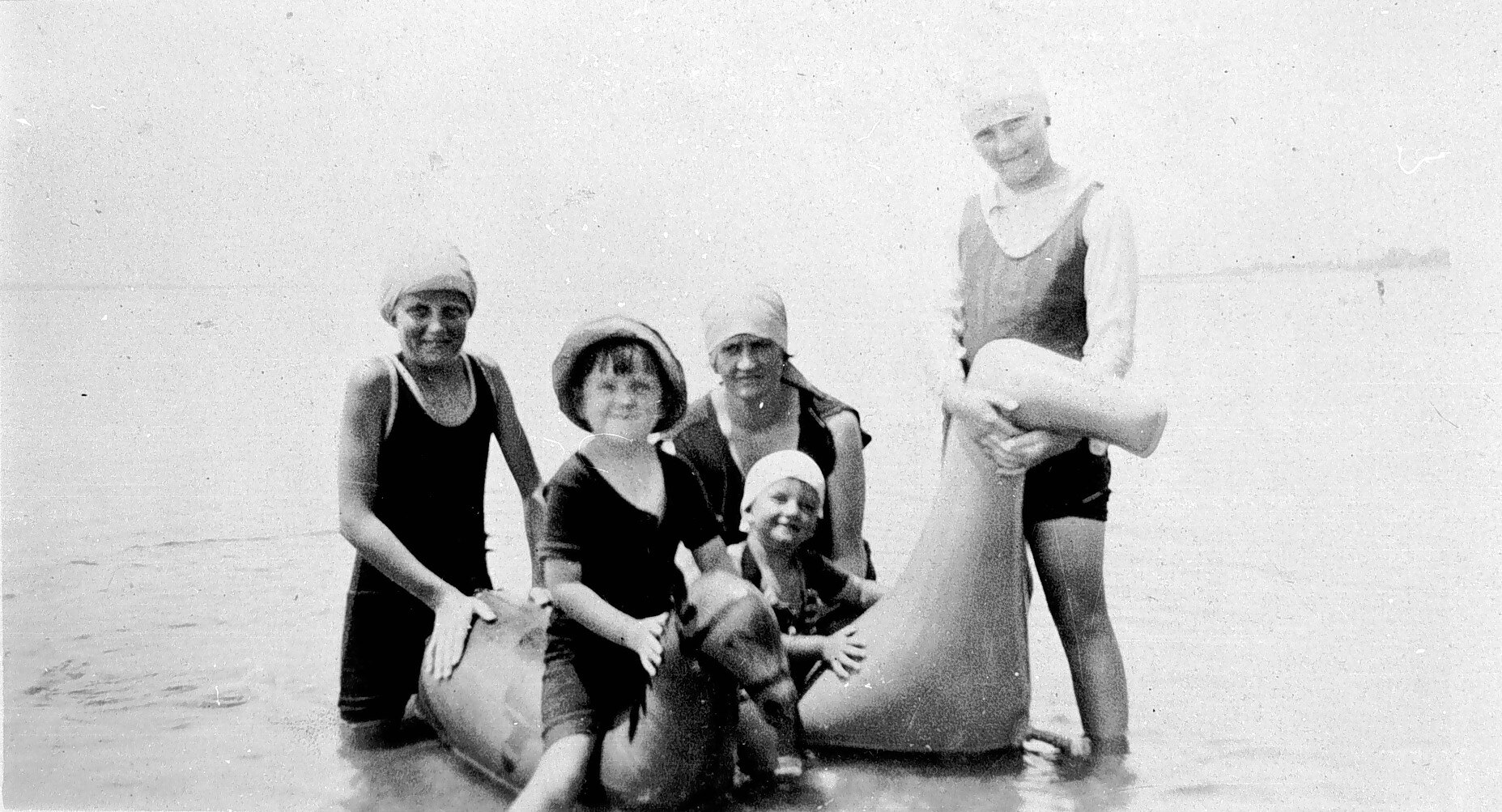 A woman and four children at the beach. The children have two inflatable toys (horses?).