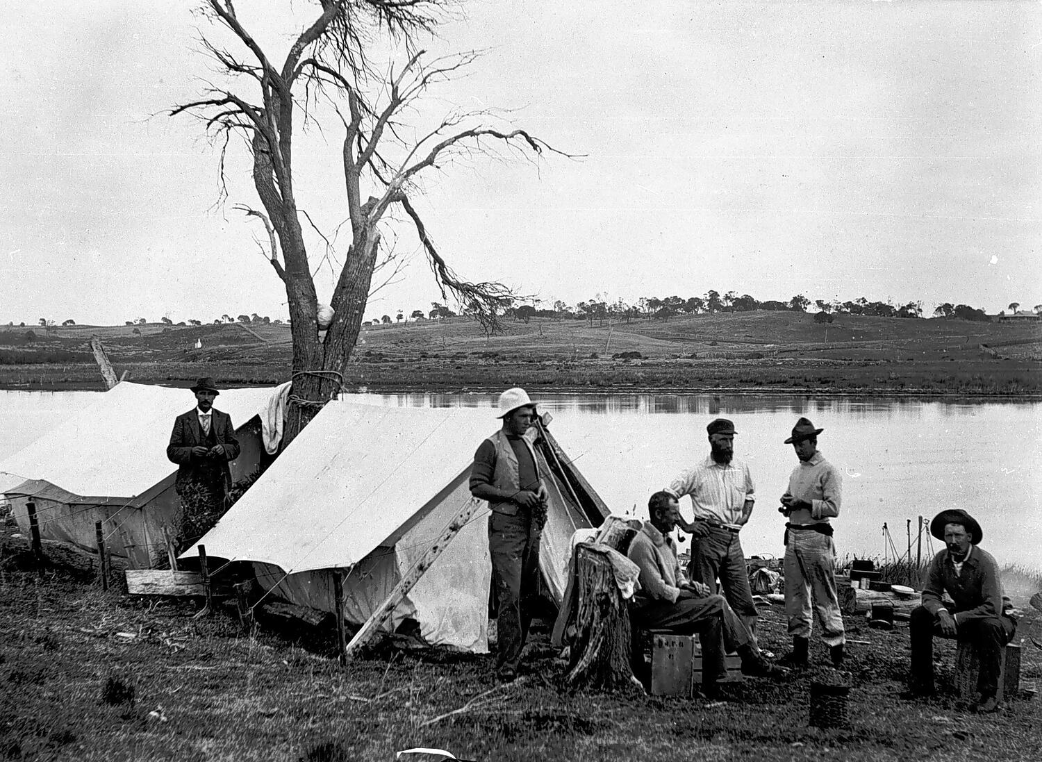 Group of men camping at flat rock on the Glenelg River.