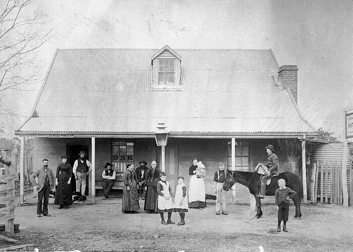 A group of people in front of the Oxley Hotel. There is a street lamp in front of the hotel and a man on horseback on the right.