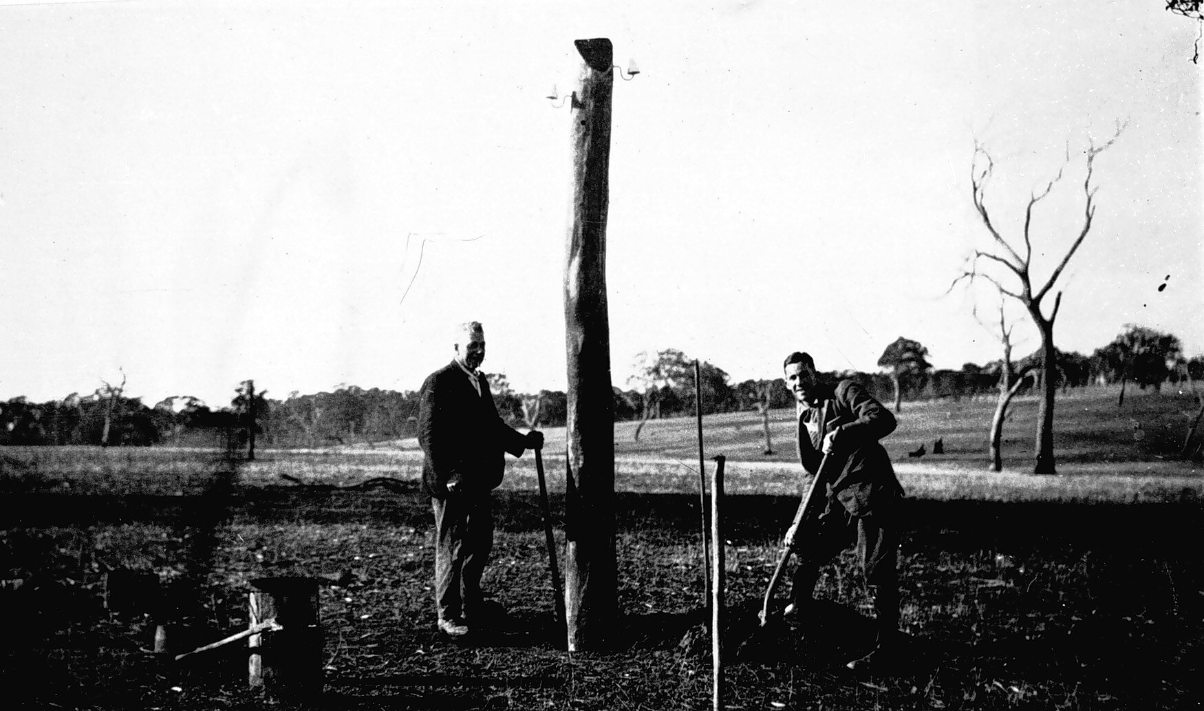 Two men erecting a pole for a private telephone line on 'Redwood' property.