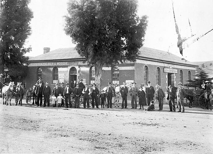 A group outside 'Thornton, Palmer and Moodie, Auctioneers'. This building was built by the Henty brothers of 'Mertham' as a grain and wool store, probably around 1850.