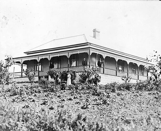 The Boland family posed on the verandah of their house and in the front garden. The house is high on a hill and the verandah extends right around the house.