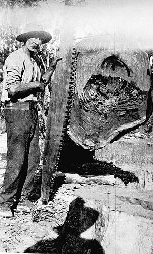 A man standing with a saw beside a log. The man, will walker, worked as a ganger and had a blind eye from fly bite.