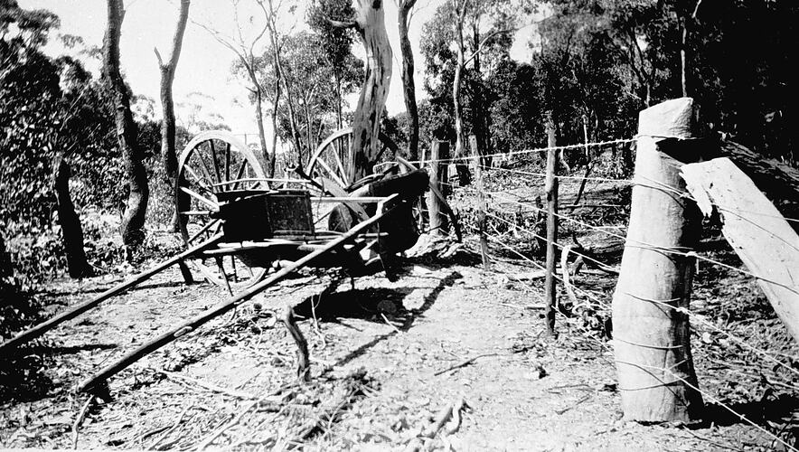 An upturned buggy next to a barbed wire fence. The pony had bolted. The occupants escaped with only a few scratches and bruises.
