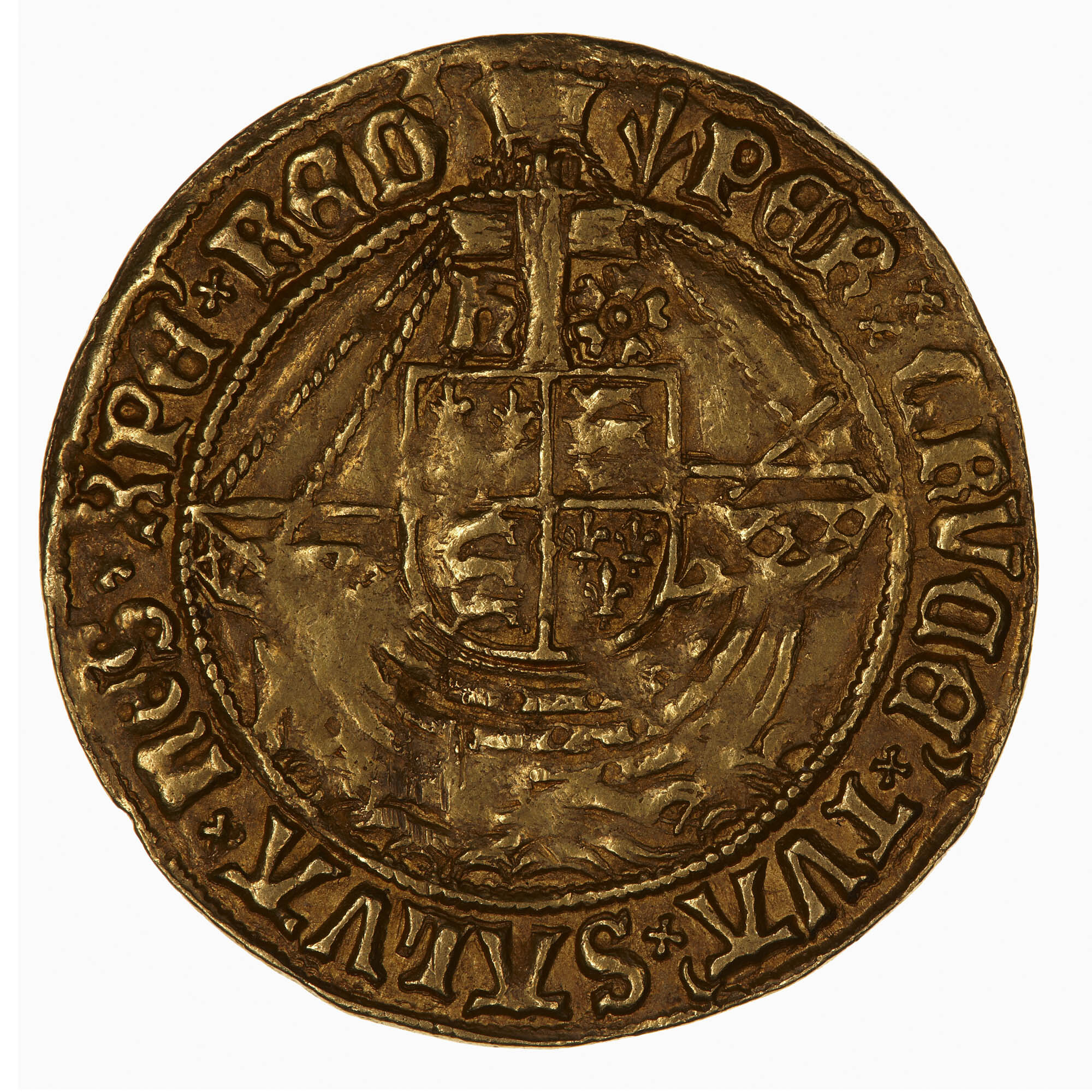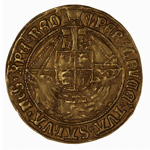 A ship with a crucifix as a mast from which hangs a shield quartered with the arms of England and France, the cross divides an H and a rose; around, (mm pheon) PER CRVCE TVA SALVA NOS XPE RED (translation: By Thy cross save us Christ our Redeemer)