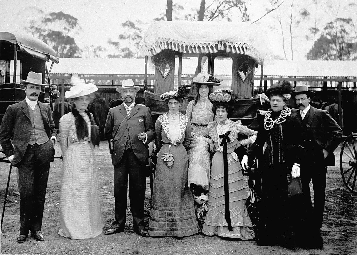 A group of very well-dressed men and women in front of an elaborately decorated carriage.