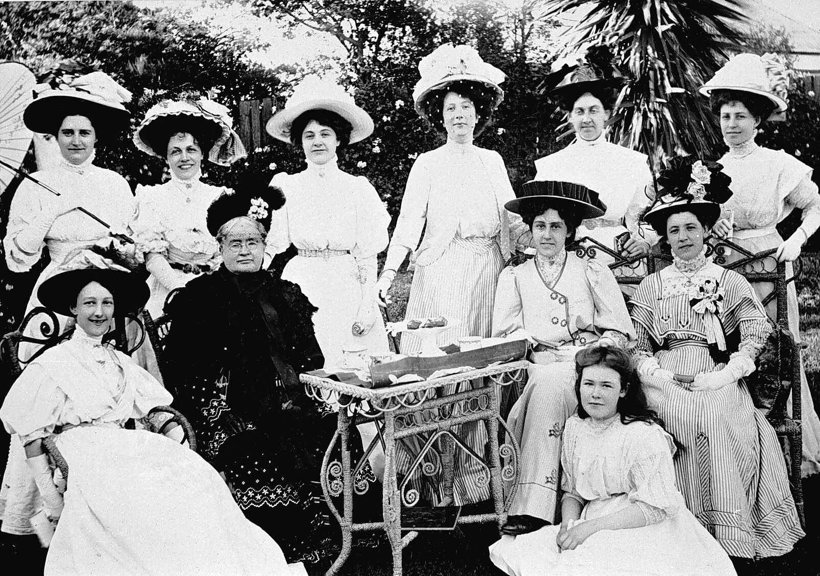 A group of women around a small tea table in a garden.