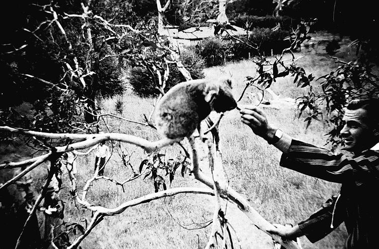 A man feeding a koala. He has climbed a tree and there are people on the ground watching.