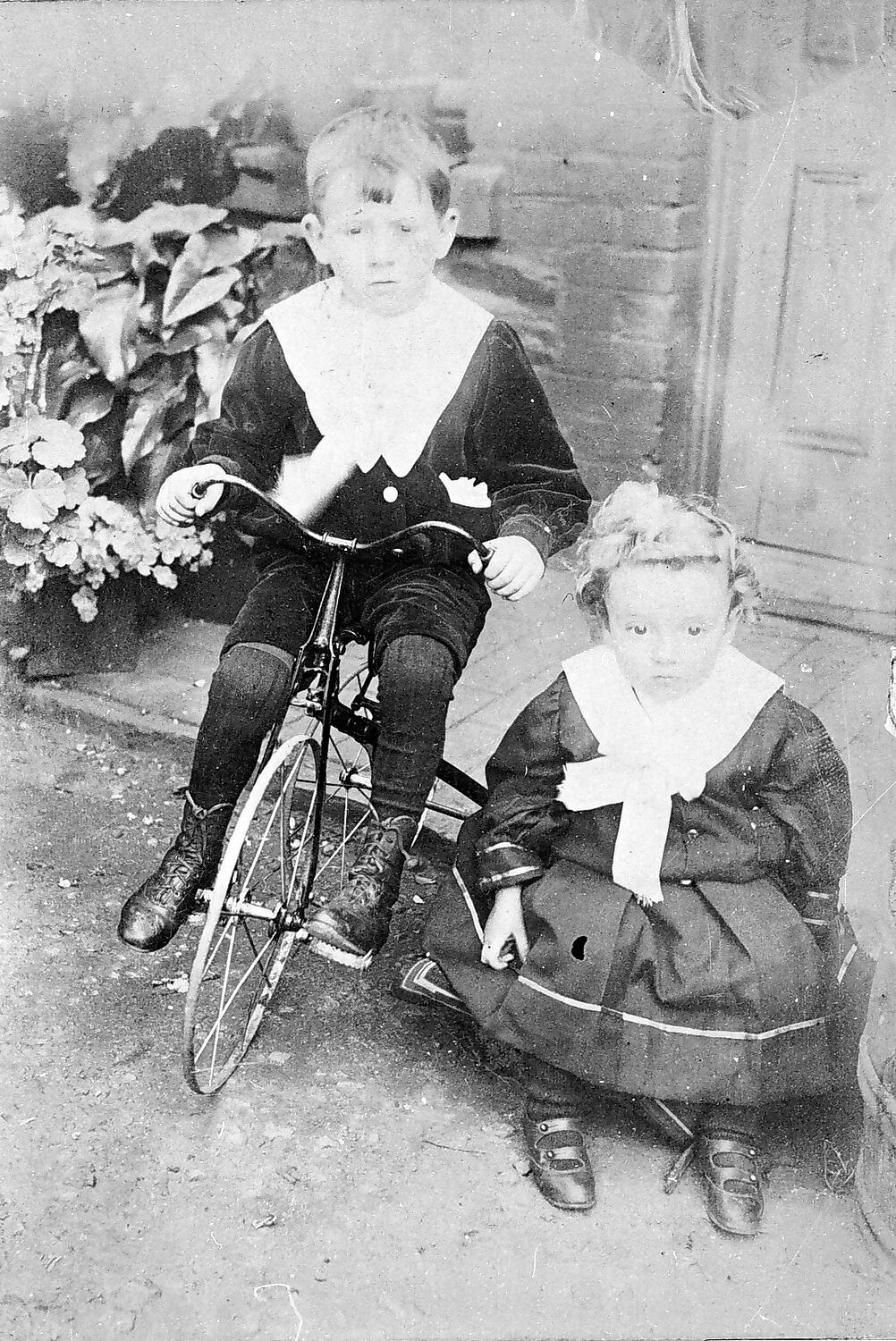 A studio portrait of two small boys. One sits on a tricycle while the other, who is wearing skirts, sits on a stool. He is holding a penny in his hand as he had to be bribed to sit still.