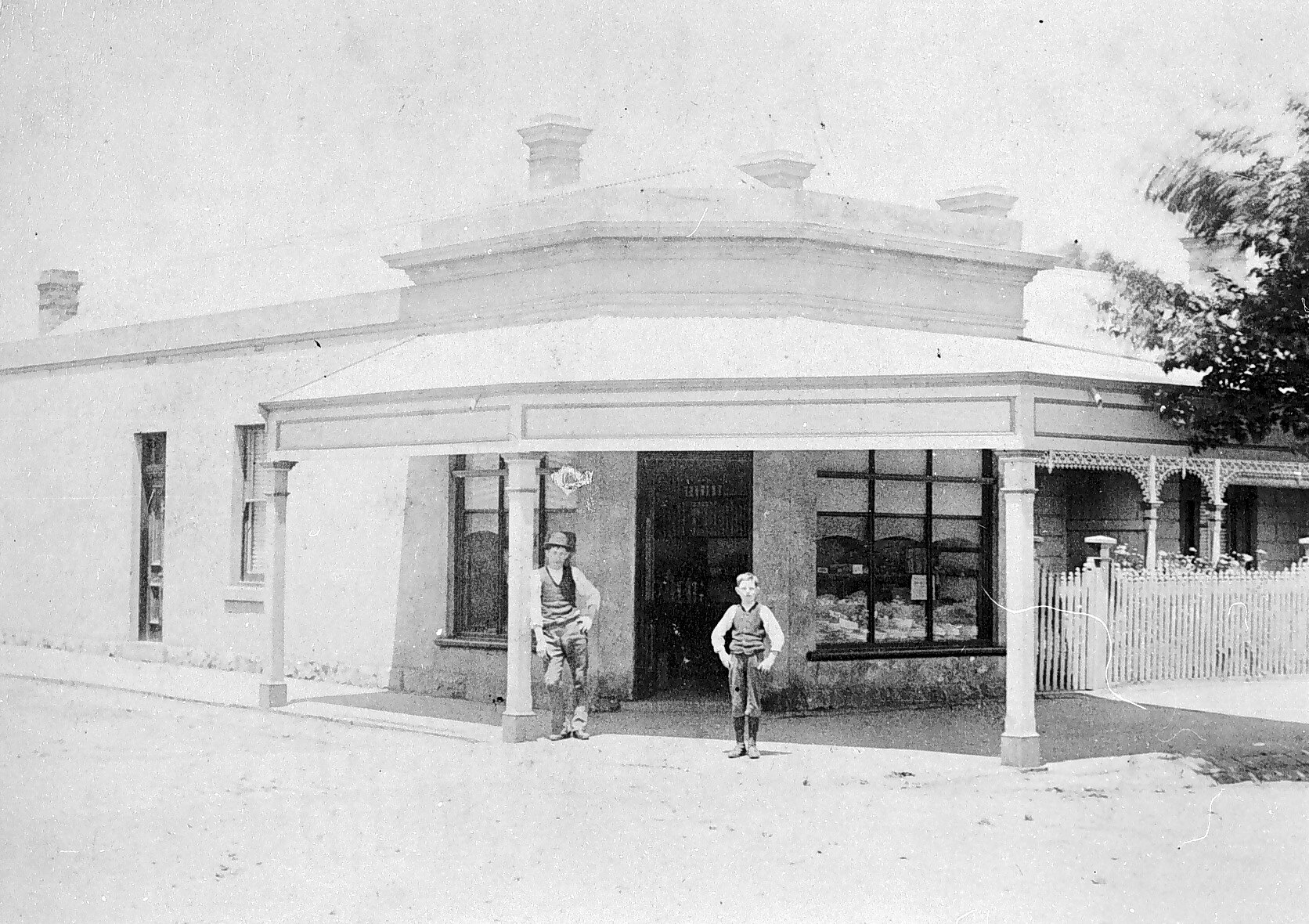 A man and his son outside the corner store which the family ran. There is a residence attached at the side of the shop.